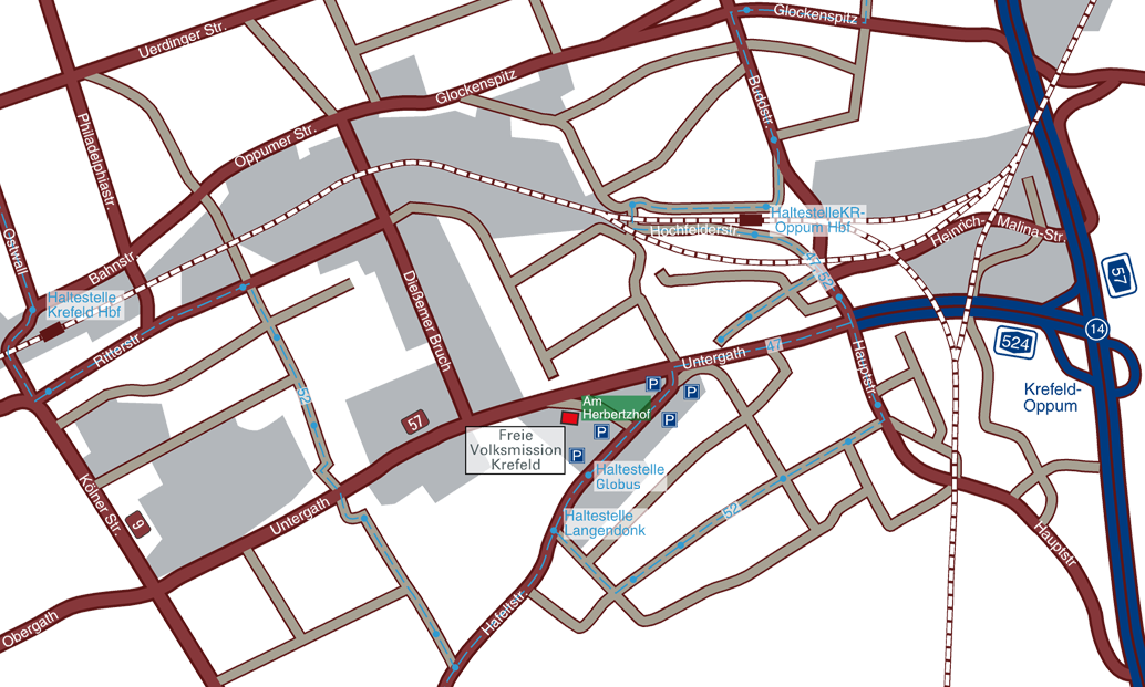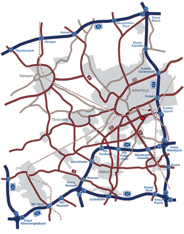 take exit Krefeld-Oppum (14), continue on Untergath, turn left at the 3rd traffic light into Hafelstraße and shorty afterward turn right into Am Herbertzhof.